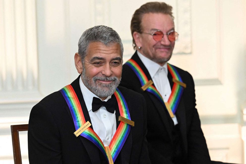 Kennedy Center ehrt Der amerikanische Schauspieler George Clooney und Bono von U2 nehmen am 4. Dezember 2022 in Washington an einem Empfang für die Preisträger des Kennedy Center im East Room des Weißen Hauses Teil.