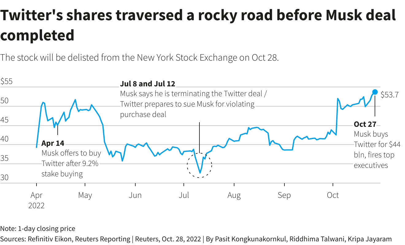 Die Twitter-Aktien beendeten den Handel am Donnerstag um 0,3 % höher bei 53,86 $, knapp unter dem vereinbarten Preis. Die Aktie wird am Freitag von der New Yorker Börse dekotiert.