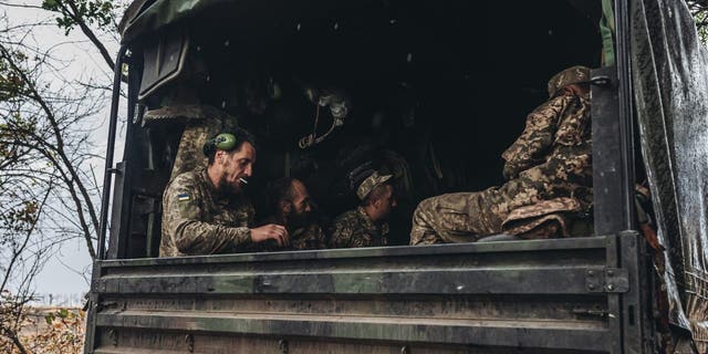 Donbass, Ukraine – 23. Juli: Ukrainische Soldaten in einem Lastwagen an der Donbass-Frontlinie Donezk (Ukraine), 23. Juli 2022.