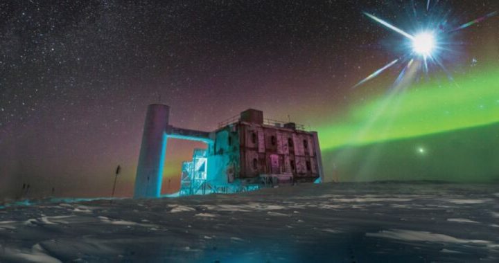 Zoomen / Künstlerische Darstellung einer kosmischen Neutrinoquelle, die über dem IceCube-Observatorium in der Antarktis scheint. Unter dem Eis befinden sich...