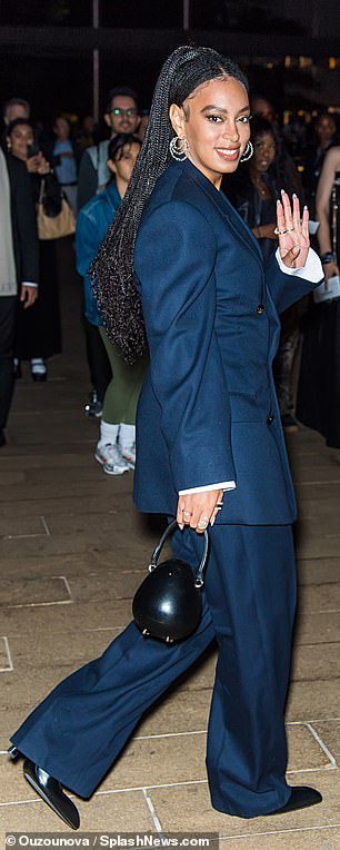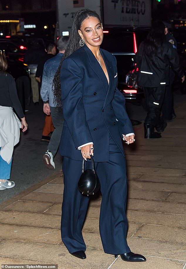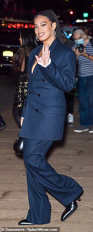 Blaue Stimmung: Solange sah mühelos schick aus, als sie in ihrem marineblauen Anzug ging, der ein weißes Einstecktuch und weiße eingebaute Ärmel enthielt, obwohl sie unter ihrer Jacke oben ohne aussah. Sie kombinierte es mit einer locker sitzenden blauen Hose