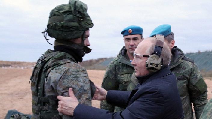 Das Video zeigt weiterhin Soldaten, die sich einer militärischen Ausbildung unterziehen, und eine Aufnahme von Putin, der eine Reihe von Soldaten untersucht, während er mit einem Reservisten spricht.